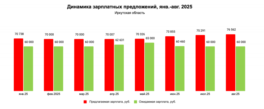 Аналитики российской рекрутинговой платформы hh.ru зафиксировали рост зарплатных предложений работодателей в Иркутской области за первые восемь месяцев 2025 года. С января текущего года медиана предлагаемой заработной платы увеличилась на 8% и составила 76 562 рубля.