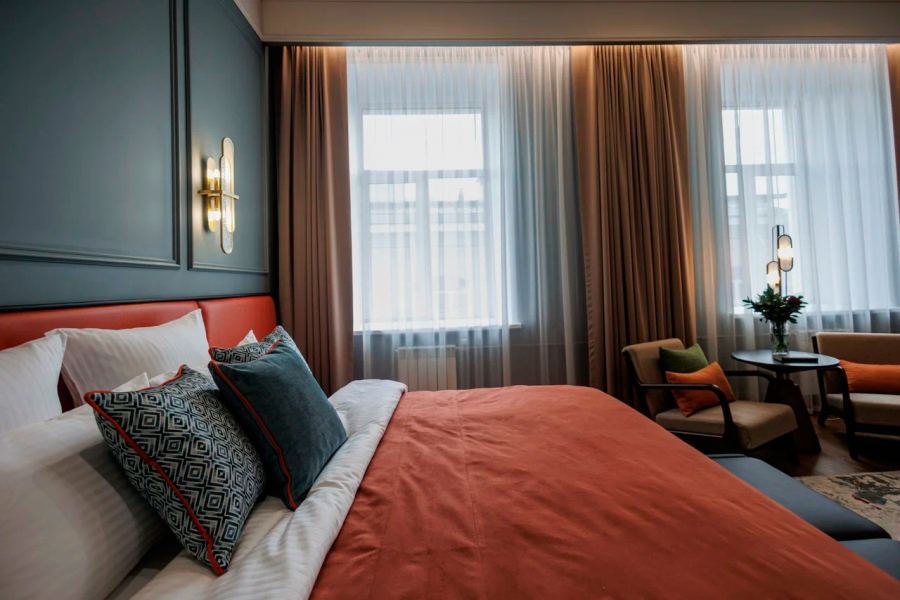 В «Пушкине» 46 номеров разных категорий – от «Стандарта» до «Президентского люкса». Благодаря архитектуре здания, историческим планировкам, которые также остались неизменными, все номера в премиум-отеле – очень просторные (от 30 до 70 кв. м) и светлые. Ощущение пространства усиливается благодаря высоким – до четырех метров – потолкам и большим окнам, из которых открываются прекрасные виды на центр города и уютный внутренний двор.
