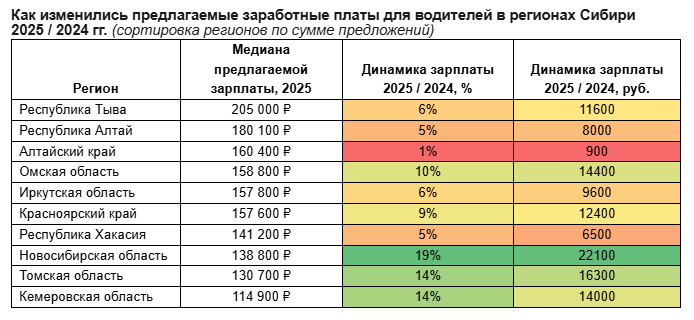 Наибольший рост зарплатных предложений за год зафиксирован в Новосибирской области, где работодатели подняли оплату труда водителей на 19%. В Томской области и Кузбассе прирост составил 14%, что свидетельствует об усилении конкуренции за квалифицированные кадры.