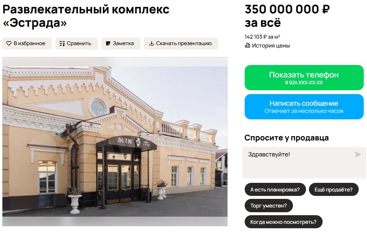 В здании есть действующий бизнес. Имеются банкет-холл «Эстрада», ресторан «Бутин» с авторской кухней, караоке-клуб «Не стреляйте в пианиста» и летняя веранда «Дача Бутина», следует из данных в объявлении на популярном сервисе.