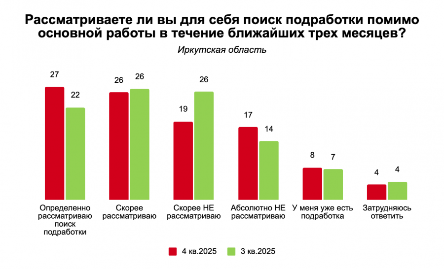 В настоящее время только 8% опрошенных в Иркутской области уже имеют дополнительную занятость помимо основной работы. В основном это специалисты из сфер фитнеса, красоты, развлечений и домашнего персонала.