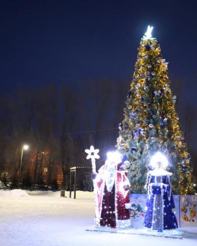Елка в парке «Комсомольский» украшена детскими игрушками в авиационной тематике, включая самолеты, воздушные шары и сказочный образ Бабы Яги в ступе. Торжественное открытие этого новогоднего символа состоялось 31 декабря 2025 года.