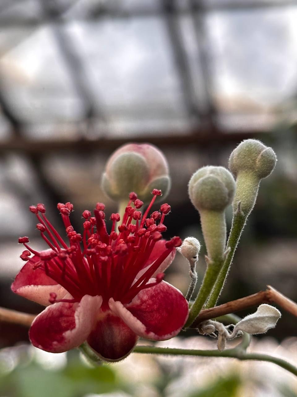 В оранжерее Ботанического сада Иркутского государственного университета в разгар сибирской зимы зацвело тропическое растение – фейхоа. Дерево возрастом около 20 лет поступило в сад из частной коллекции в конце ноября 2025 года и уже адаптировалось к новым условиям, выпустив первые соцветия.