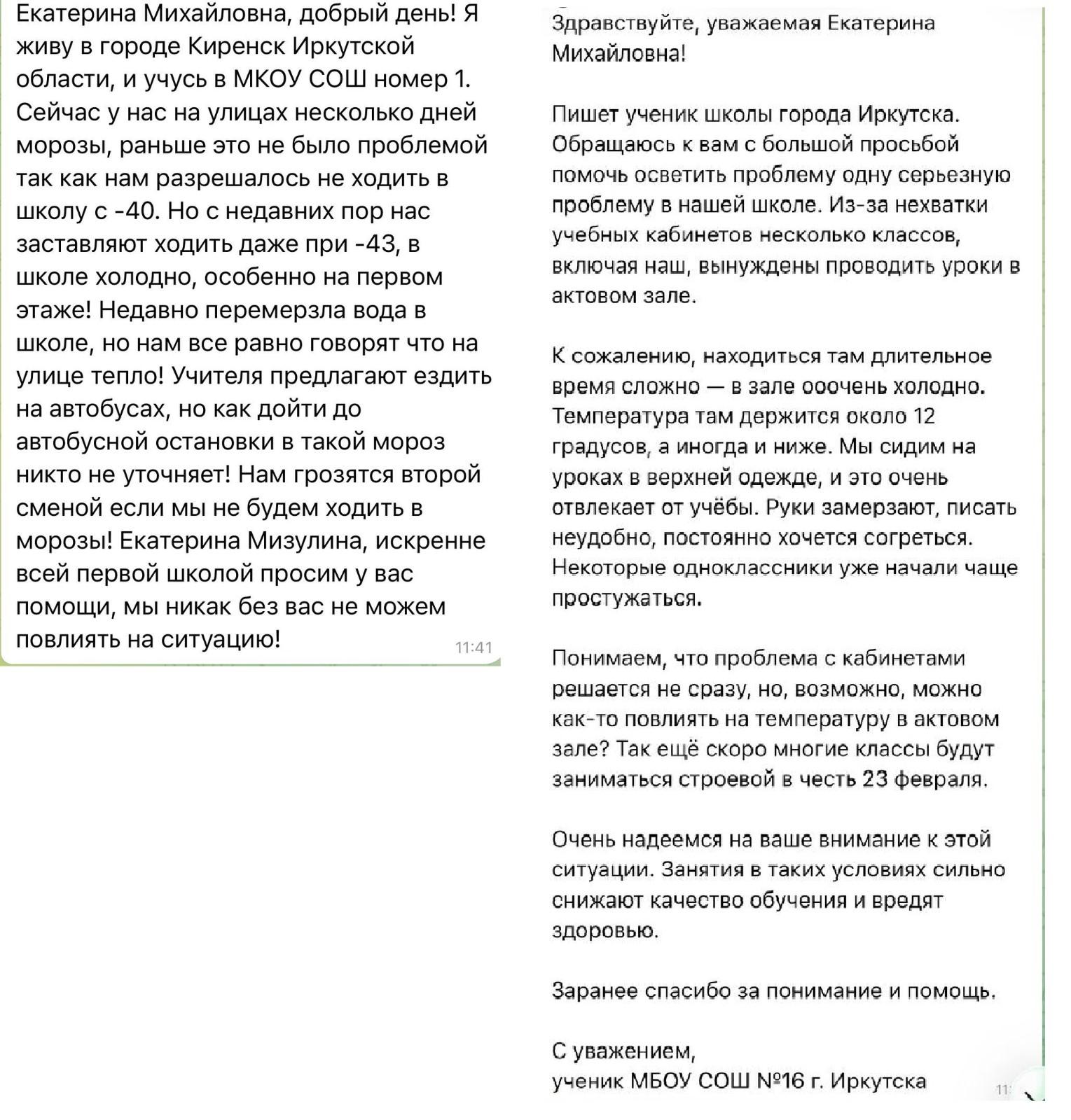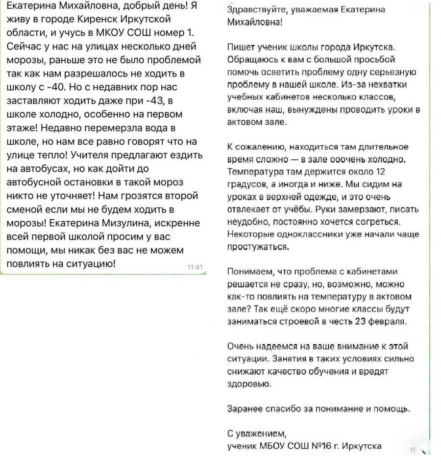 «В некоторых письмах ребята говорят, что запрещают сидеть на уроках в кофтах и другой теплой одежде», – пишет Екатерина Мизулина.