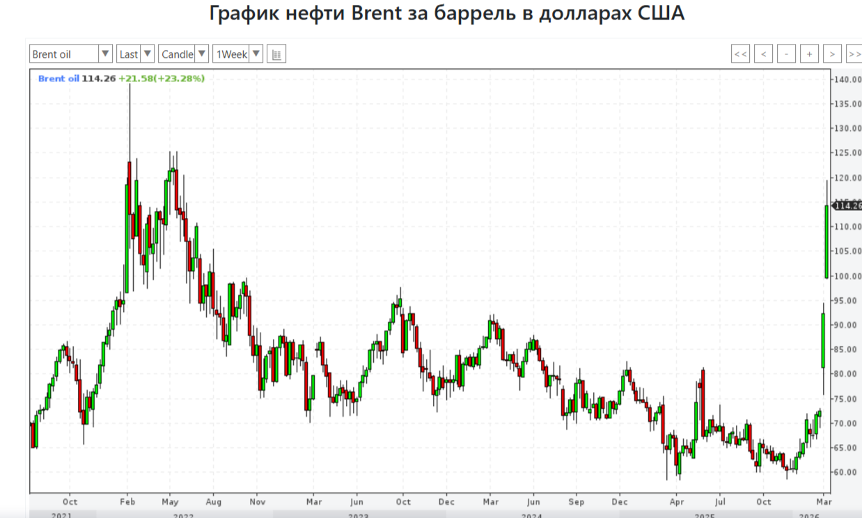 Цены на нефть Brent достигли отметки почти $120 за баррель, максимума с июля 2022 года. С начала прошлой недели котировки выросли более чем на 50% на фоне обострения ситуации на Ближнем Востоке и опасений, что перекрытие Ормузского пролива может привести к длительным перебоям в поставках, передаёт РБК.