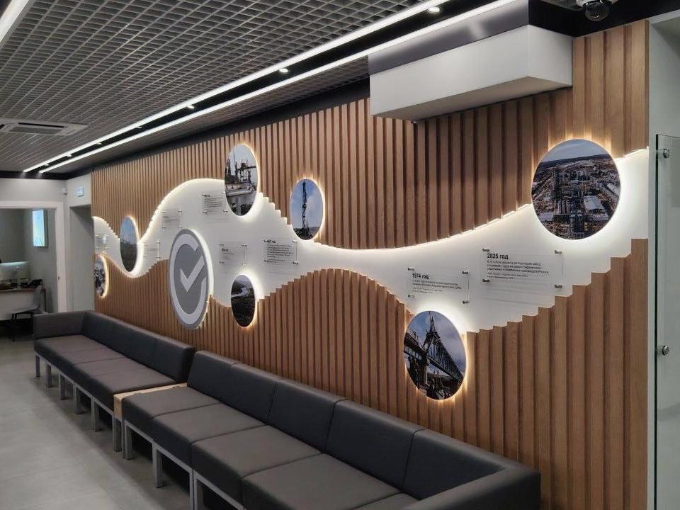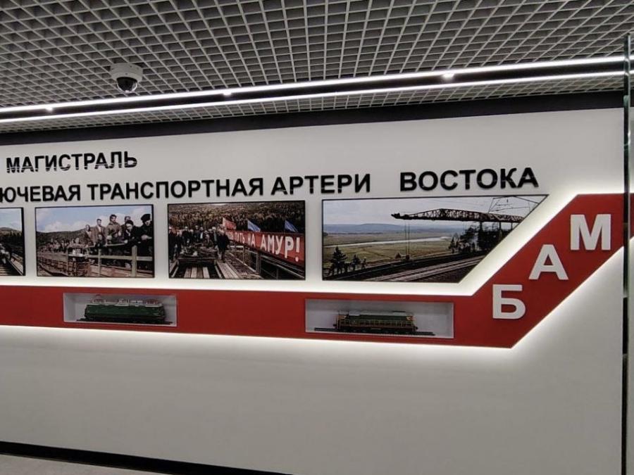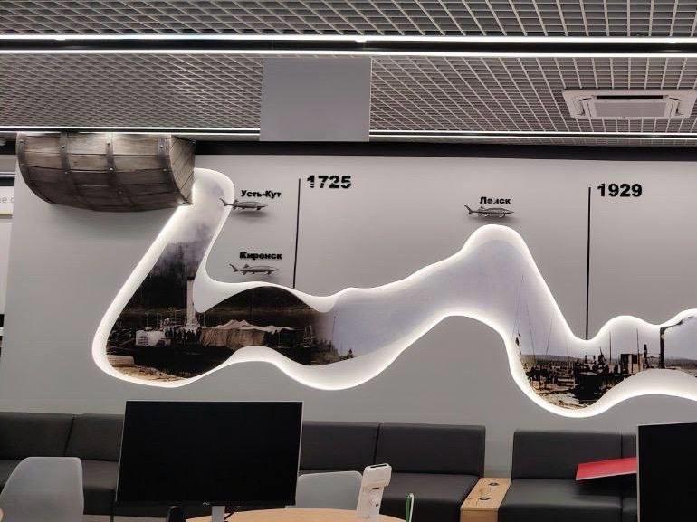 На стенах — ключевые вехи истории края: от основания острога в 1631 году и солеваренного завода до строительства Байкало-Амурской магистрали, организации нефтедобычи и завода полимеров, открытого в 2025 году.