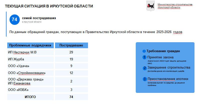 Официальный реестр пострадавших от недобросовестных застройщиков граждан в Иркутской области сформируют до конца апреля. Аналогичные реестры составляют и в других регионах.