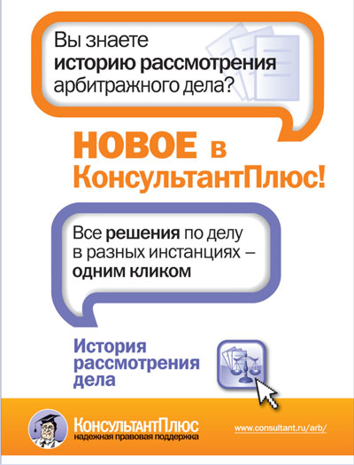 В системе КонсультантПлюс появилась новая возможность - "История рассмотрения дела". Теперь получить все решения по арбитражному делу в разных инстанциях можно всего одним кликом. Новая возможность позволяет быстро построить список решений по итогам рассмотрения дела во всех инстанциях: от арбитражного суда первой инстанции до ВАС РФ.