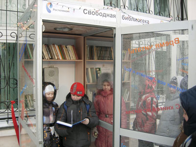 В Иркутске открылась первая уличная мини-библиотека свободного чтения. «Свободная библиотека» – так называется совместный проект компании «Ростелеком» и Иркутской областной детской библиотеки им.Марка Сергеева. В церемонии открытия принимали участие министр культуры и архивов Иркутской области Виталий Барышников и Директор Иркутского филиала ОАО «Ростелеком» Олег Ширшов.