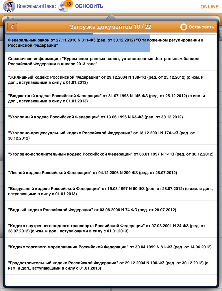 Напомним, что приложения работают в двух режимах: онлайн и оффлайн. Для работы без выхода в интернет (в режиме оффлайн) можно заранее сохранить в "Избранное" до 100 документов. Кнопка "Обновить" запускает обновление этих документов. В режиме онлайн можно работать с полной базой документов приложения.