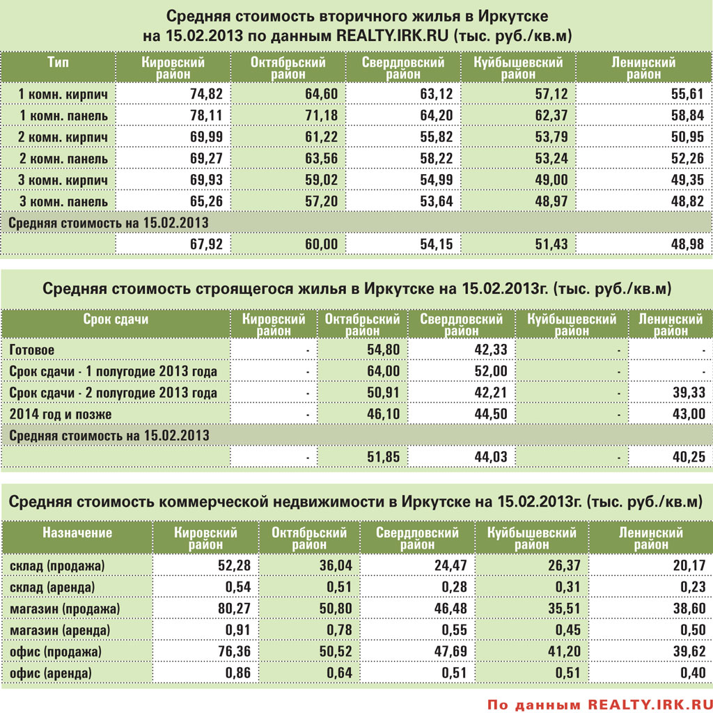 Однокомнатные квартиры в кирпичных домах Иркутска стоят от 55 до 74 тыс.руб за кв.метр. Средние цены на недвижимость в Иркутске на 15.02.2013
