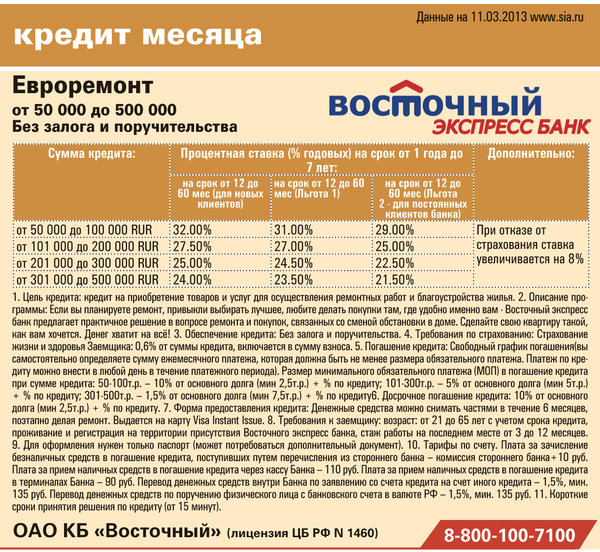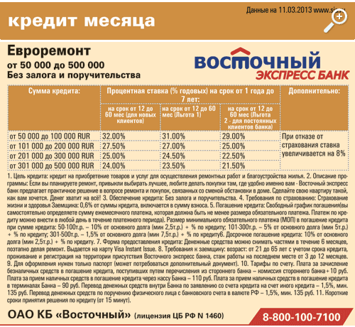 Кредит месяца от ОАО КБ «Восточный»: на ремонт и благоустройство жилья