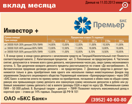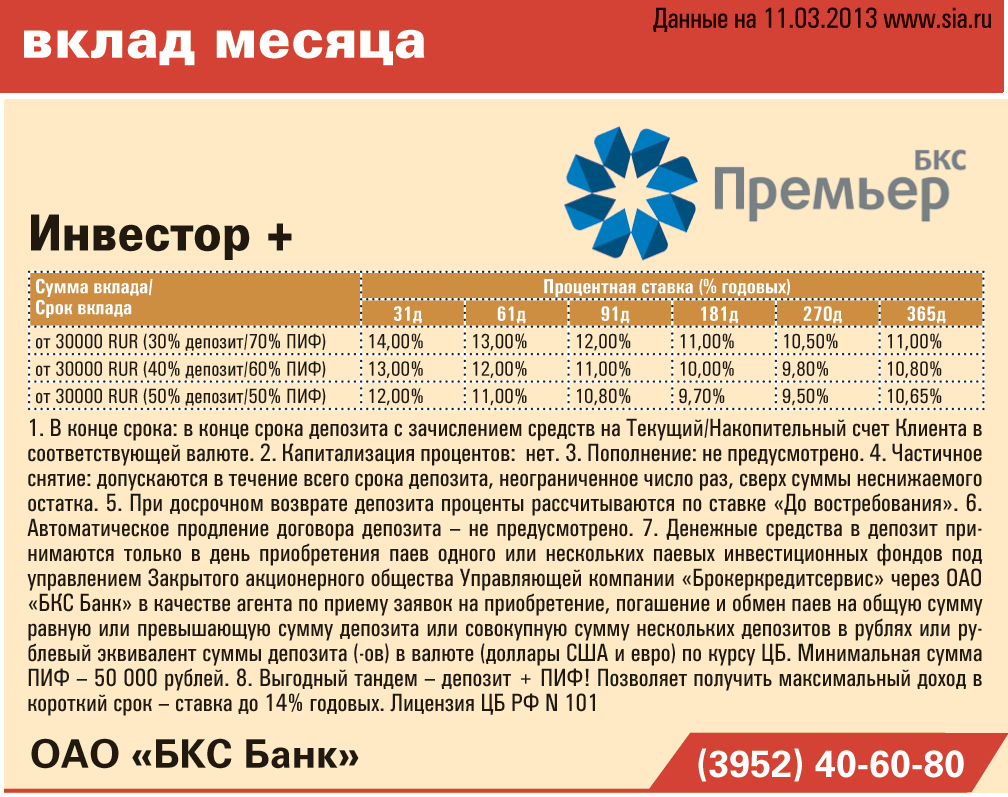 Вклад месяца от БКС Банка: Выгодный тандем - депозит +ПИФ! Позволяет получить максимальный доход в короткий срок - ставка до 14% годовых
