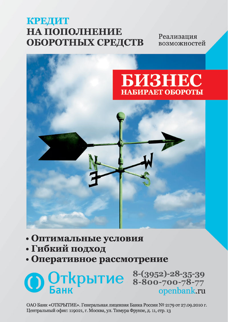 Банк Открытие предлагает кредит на пополнение оборотных средств и обещает оптимальные условия, гибкий подход и оперативное рассмотрение заявки