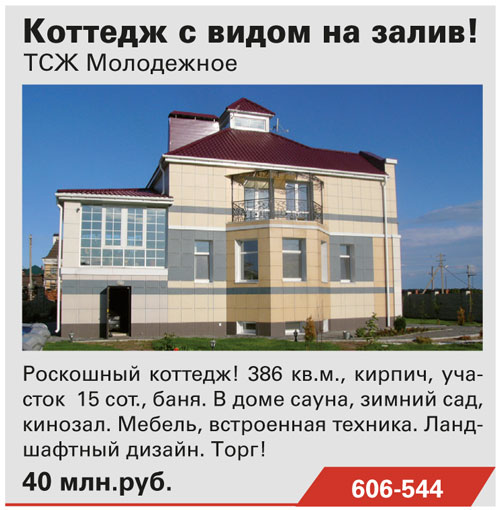 Продается роскошный коттедж с видом на залив! ТСЖ Молодежное. Стоимость 40 млн.рублей (фото)