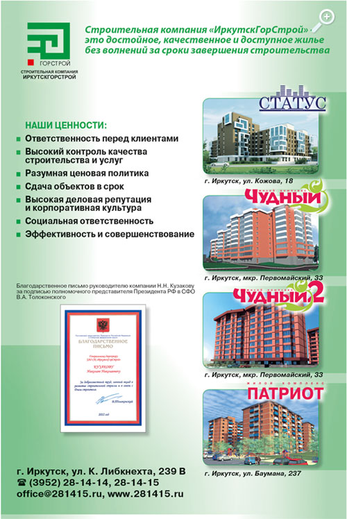 Строительная компания "ИркутскГорСтрой" предлагает качественное жилье без волнений за сроки завершения строительства: квартиры в жилых комплексах на ул. Кожова, Баумана, мкр. Первомайский