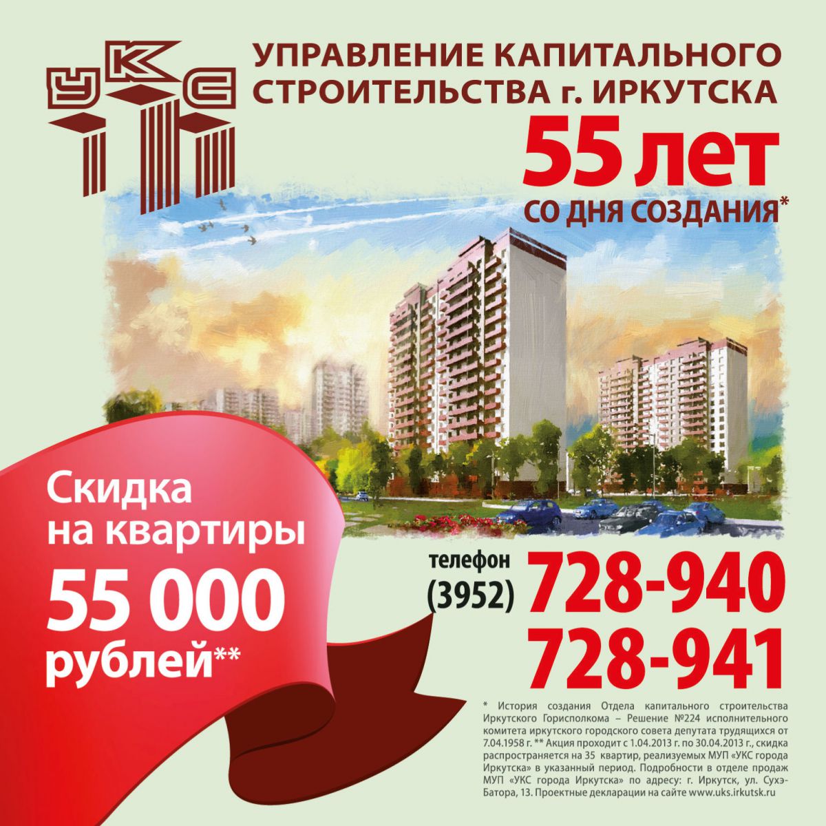 Управление капитального строительства г. Иркутска в честь 55-летия со для создания компании продает квартиры со скидкой 55 000 рублей