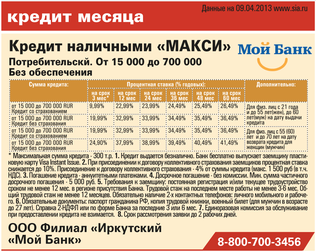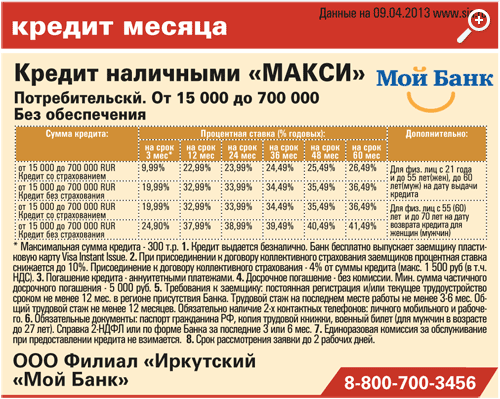 Мой Банк предлагает воспользоваться потребительским кредитом "МАКСИ". Сумма кредита - до 700 т.р. Ставка - от 9,99% годовых