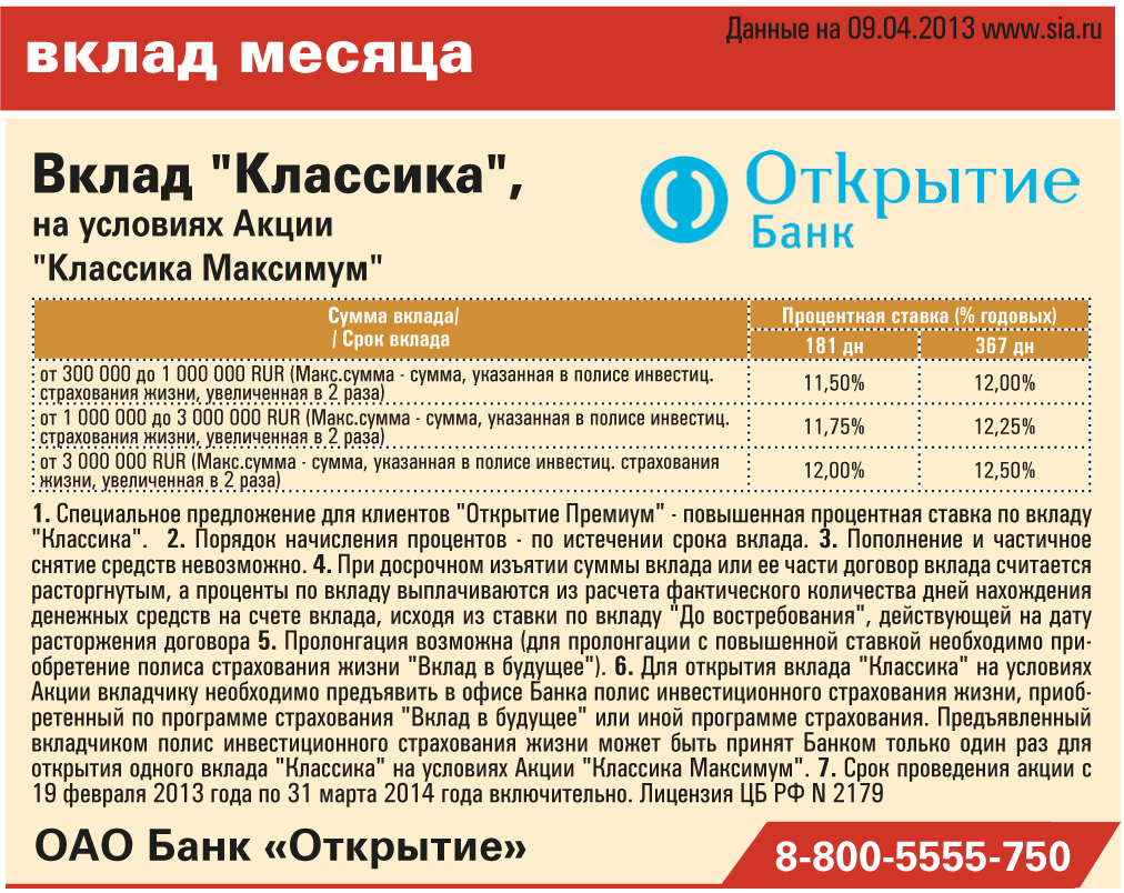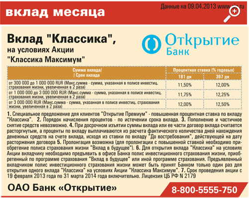 Специальное предложение для клиентов "Открытие Премиум" - повышенная до 12,5% годовых ставка по вкладу "Классика"