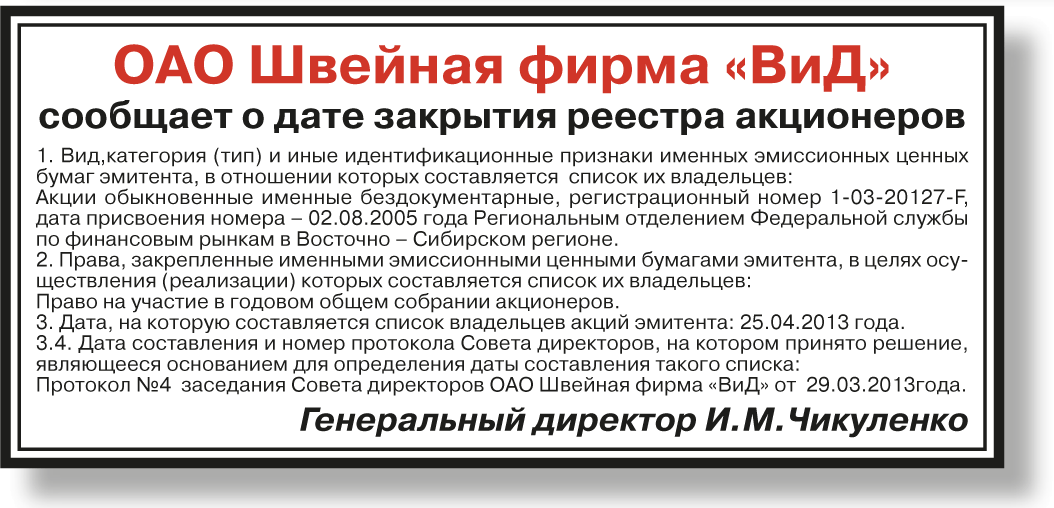 ОАО Швейная фирма "ВиД" сообщает о дате закрытия реестра акционеров