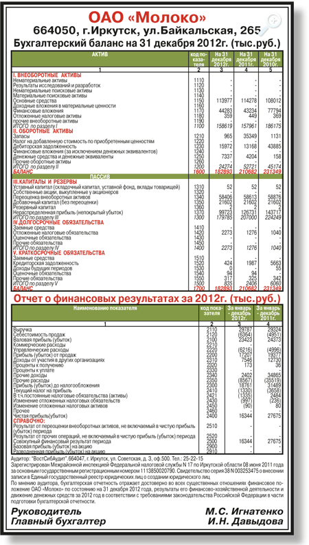 ОАО «Молоко». Годовая бухгалтерская отчетность за 2012 год