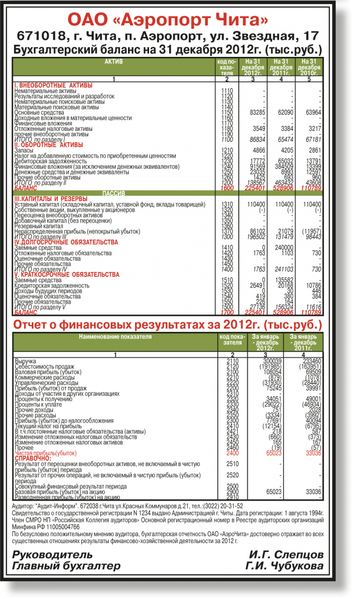 ОАО «Аэропорт Чита». Годовая бухгалтерская отчетность за 2012 год