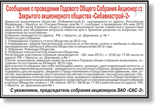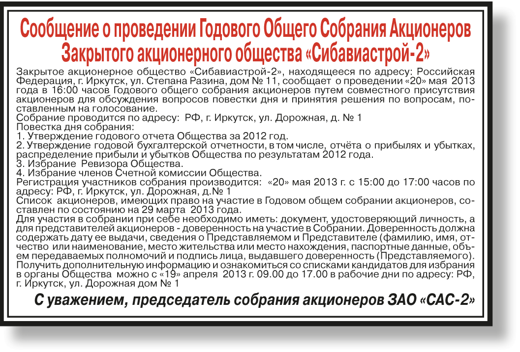Сообщение о проведении Годового Общего Собрания Акционеров Закрытого акционерного общества «Сибавиастрой-2»