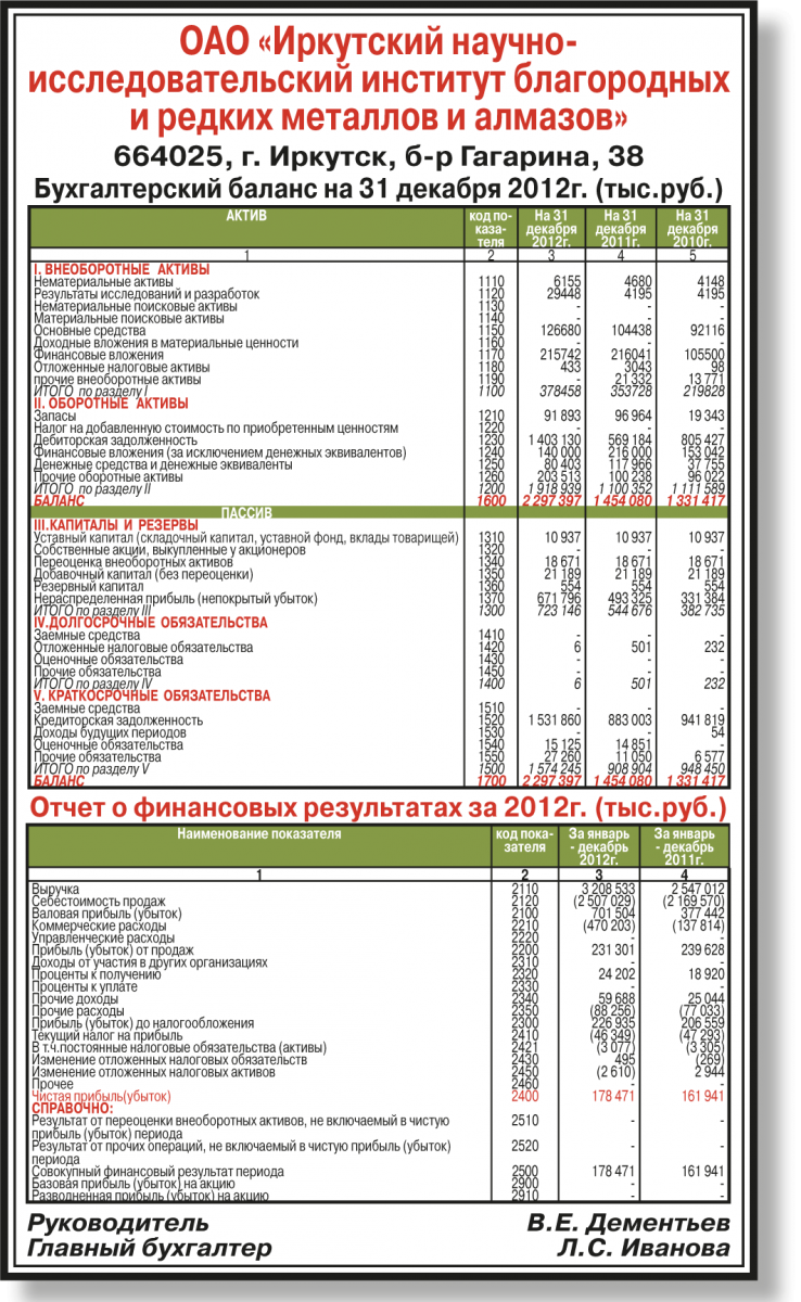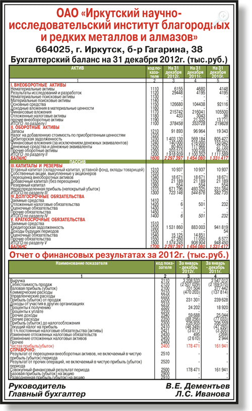 ОАО «Иркутский научно-исследовательский институт благородных и редких металлов и алмазов». Годовая бухгалтерская отчетность за 2012 год