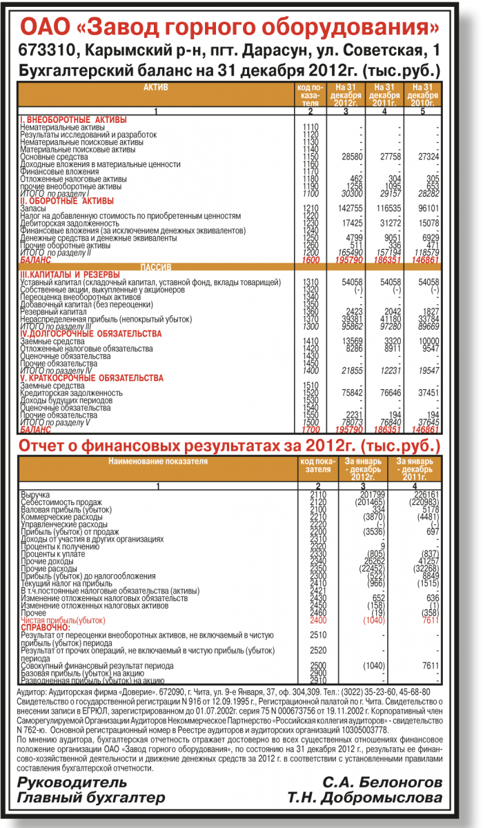 ОАО «Завод горного оборудования». Годовая бухгалтерская отчетность за 2012 год