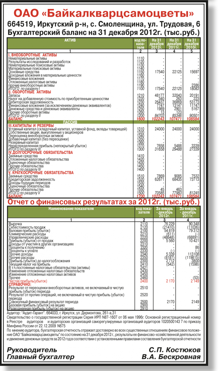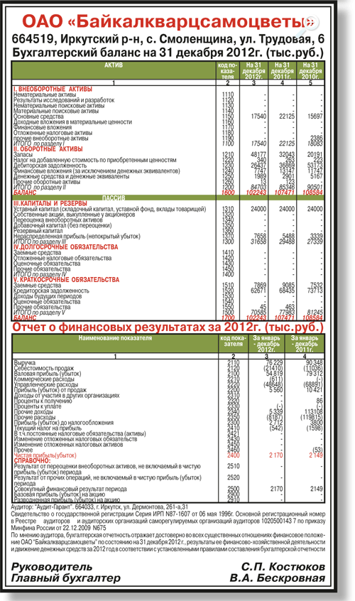ОАО «Байкалкварцсамоцветы». Годовая бухгалтерская отчетность за 2012 год