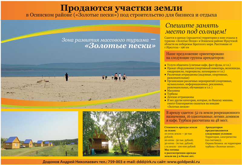 За дополнительной информацией обращайтесь: Додонов Андрей Николаевич тел: 759-003, e-mail ddd@irk.ru, сайт: www.goldpeski.ru