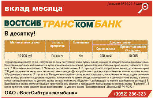 ОАО "ВостСитбранскомбанк" предлагает оформить рублевый вклад "В десятку!" на 200 дней под 10% годовых