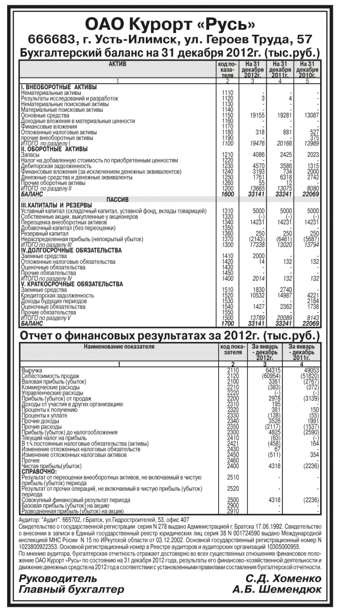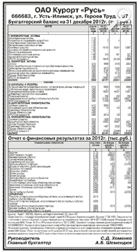 Годовая бухгалтерская отчетность ОАО Курорт «Русь» за 2012 год