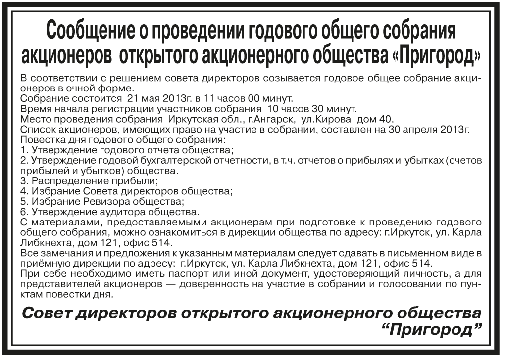Сообщение о проведении годового общего собрания акционеров открытого акционерного общества «Пригород»