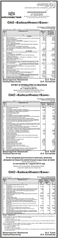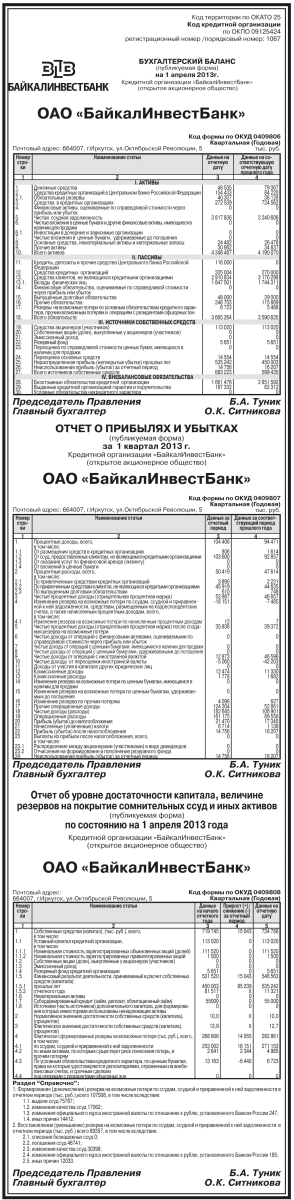 Бухгалтерская отчетность ОАО «БайкалИнвестБанк» на 1 апреля 2013 года