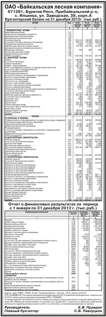 Годовая бухгалтерская отчетность ОАО «Байкальская лесная компания» за 2012 год