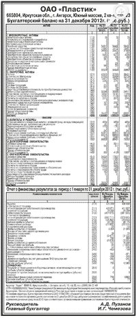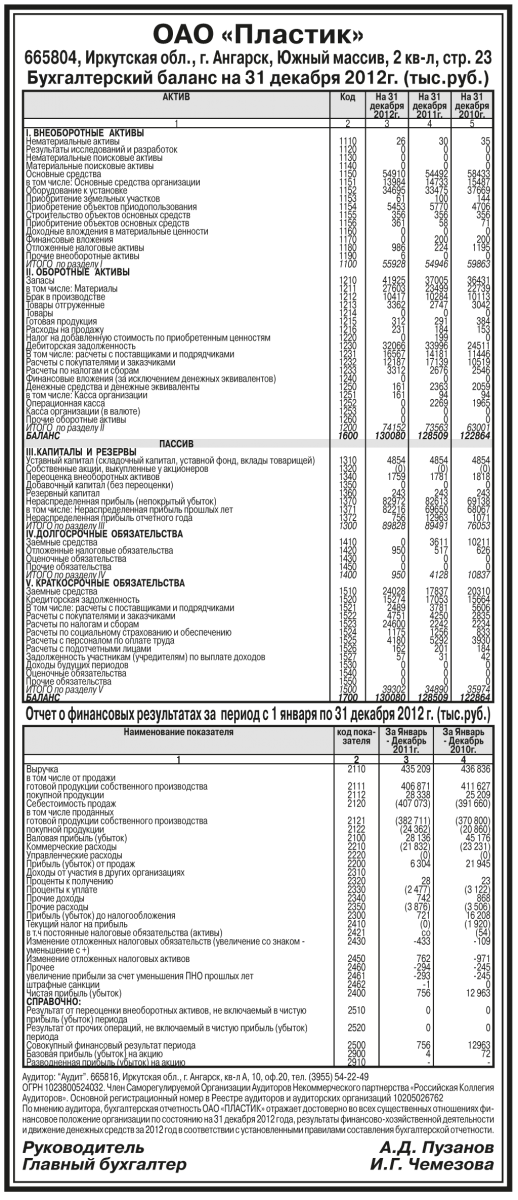 Годовая бухгалтерская отчетность ОАО «Пластик» за 2012 год