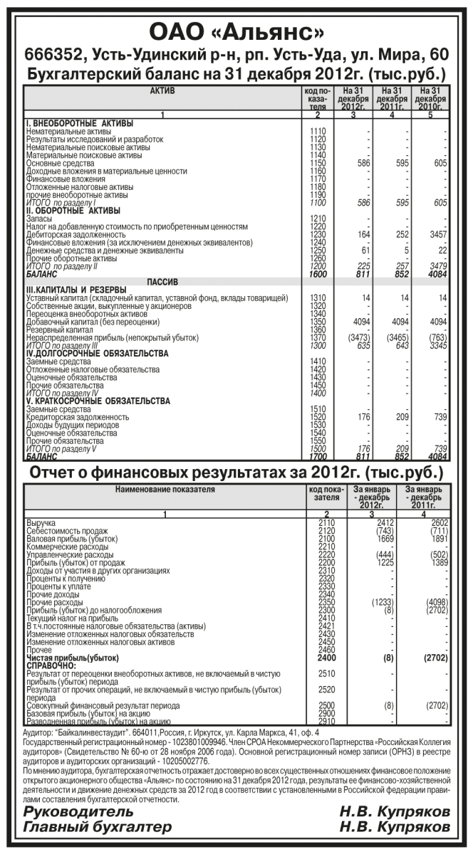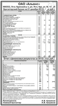 Годовая бухгалтерская отчетность ОАО «Альянс» за 2012 год