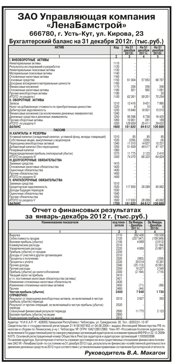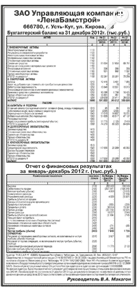 Годовая бухгалтерская отчетность ЗАО Управляющая компания «ЛенаБамстрой» за 2012 год