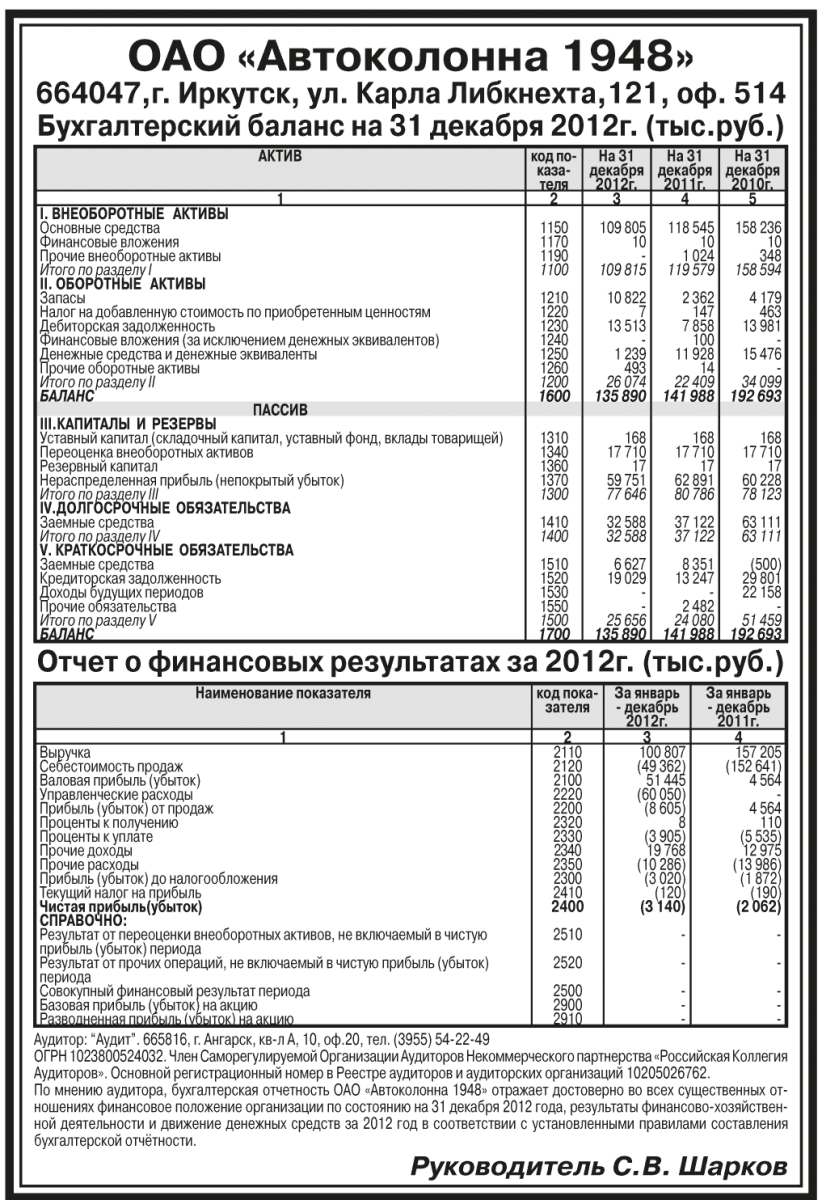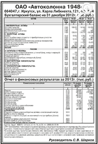 Годовая бухгалтерская отчетность ОАО «Автоколонна 1948» за 2012 год