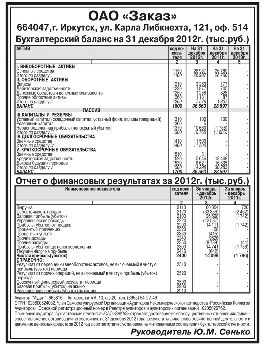 Годовая бухгалтерская отчетность ОАО «Заказ» за 2012 год