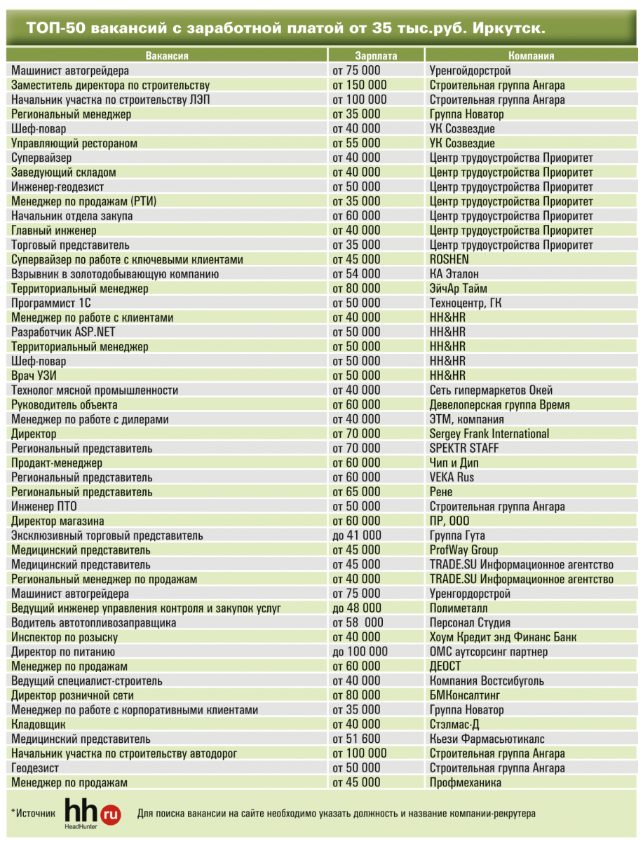 ТОП-50 вакансий с заработной платой от 35 тыс.руб. Иркутск.