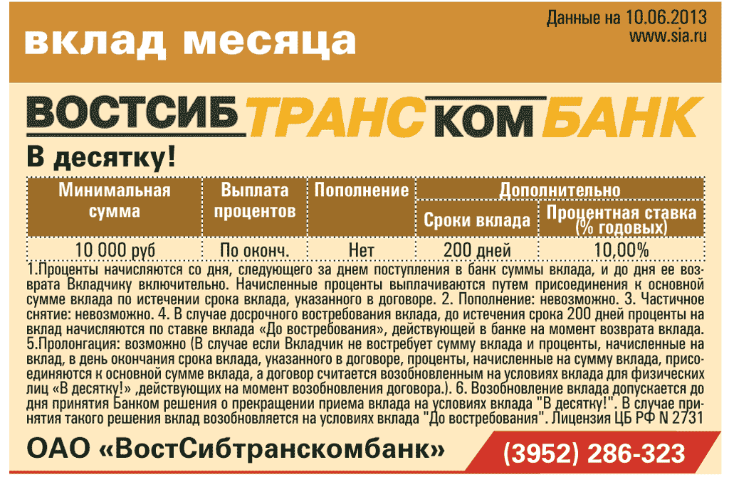 Вклад месяца. ВостСибтранскомбанк предлагает оформить рублевый вклад "В десятку!" сроком на 200 дней под 10% годовых