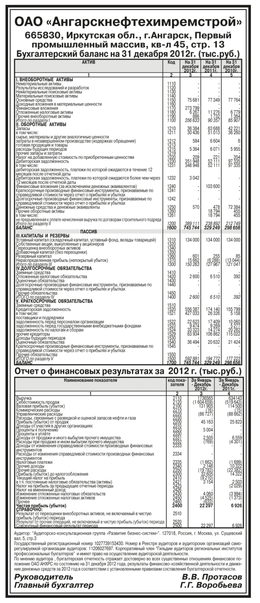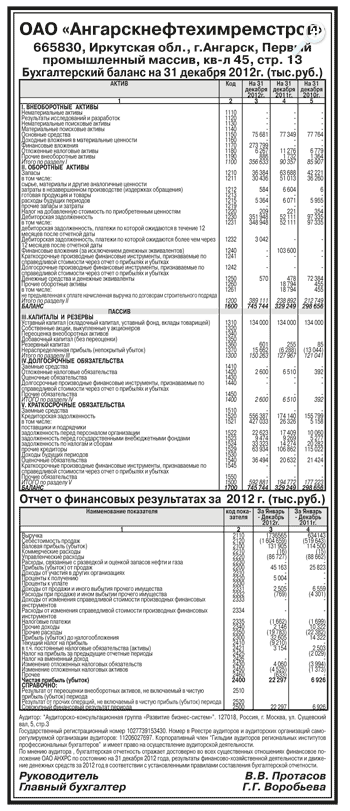 Бухгалтерская отчетность ОАО «Ангарскнефтехимремстрой» за 2012 год