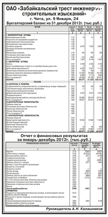 Бухгалтерская отчетность ОАО «Забайкальский трест инженерно-строительных изысканий» за 2012 год
