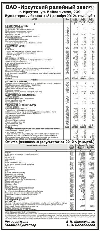 Годовая бухгалтерская отчетность ОАО «Иркутский релейный завод» за 2012 год