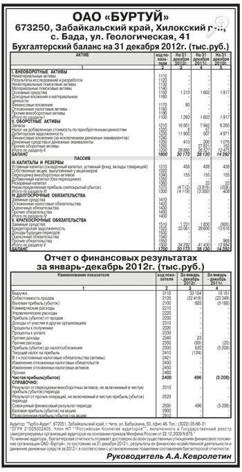Годовая бухгалтерская отчетность ОАО «БУРТУЙ» за 2012 год
