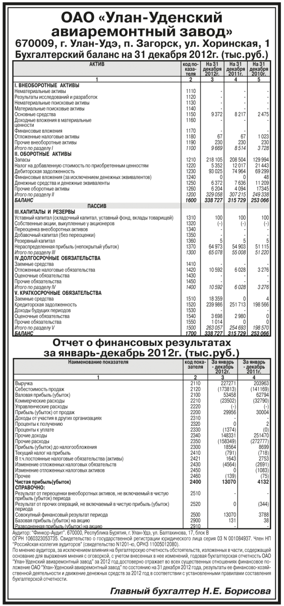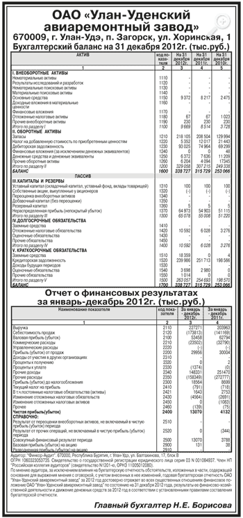 Годовая бухгалтерская отчетность ОАО «Улан-Удэнский авиаремонтный завод» за 2012 год