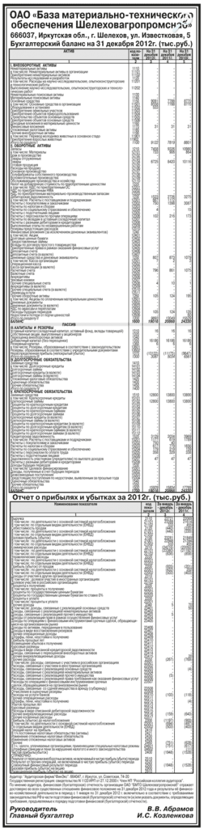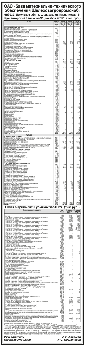 Годовая бухгалтерская отчетность ОАО «База материально-технического обеспечения Шелеховагропромснаб» за 2012 год