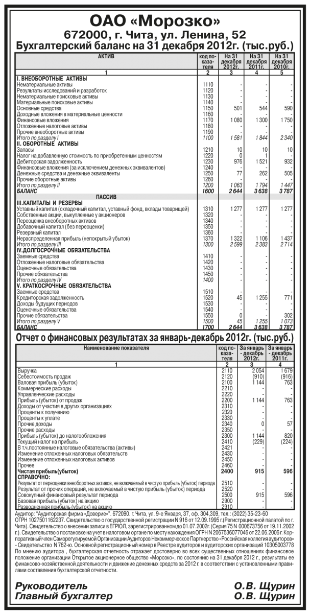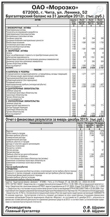 Годовая бухгалтерская отчетность ОАО «Морозко» за 2012 год